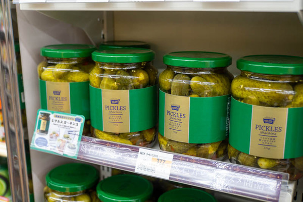 惣菜コーナー横には瓶詰めされたピクルス(322円)も。