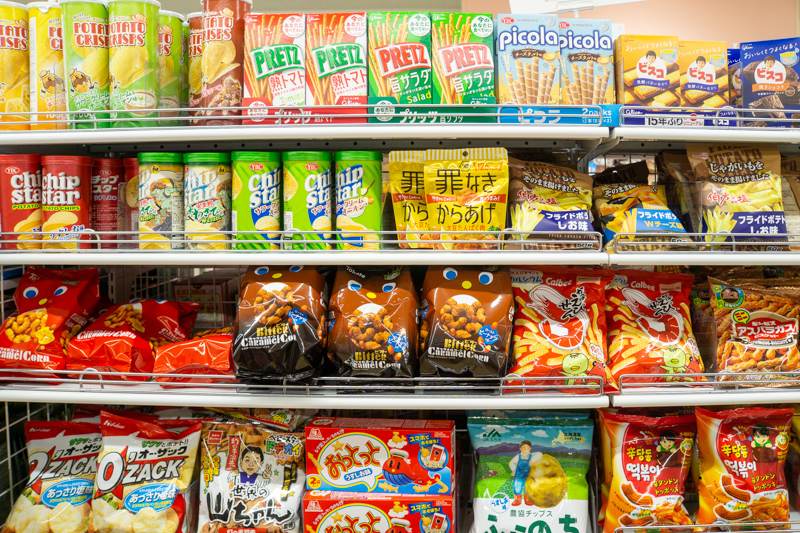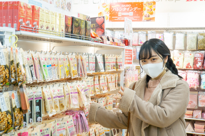 「ダイソーって店舗によってはこんな感じでお菓子もいっぱい売ってるし、ここらへんをうまく利用して‥‥」
