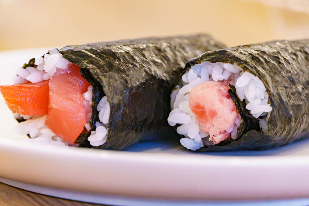 まずは定番の「鉄火巻き」と「ねぎとろ巻き」やね。切って分け分けして食べよー!