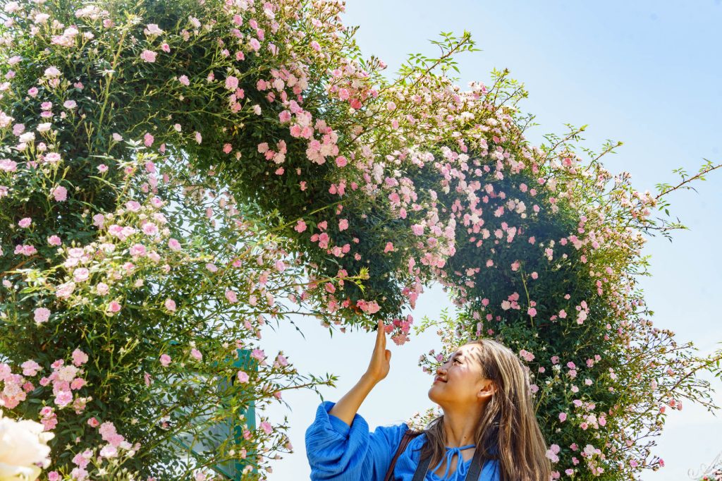 半つる性のバラたちが美しい曲線を描き絡み合うエリア。背の高いバラの通路みたいになってるところがあるので、絵面いっぱいにバラを収めることができちゃいます。