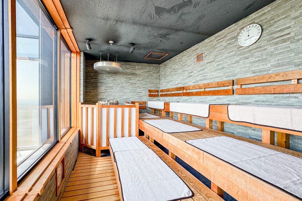 このように内風呂や洗い場からもしっかりパノラマを楽しめるんですが、ここのスゴイポイントはなんと、サウナルームすらもガラス張りというところ!