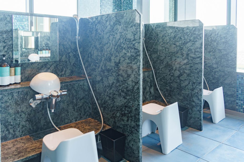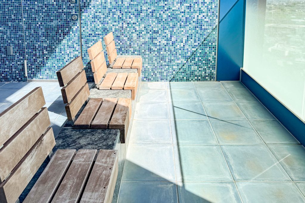 露天風呂には整いスペースも完備。地上26階に降り注ぐ心地よい日差しと風で、外気浴もバッチリです。