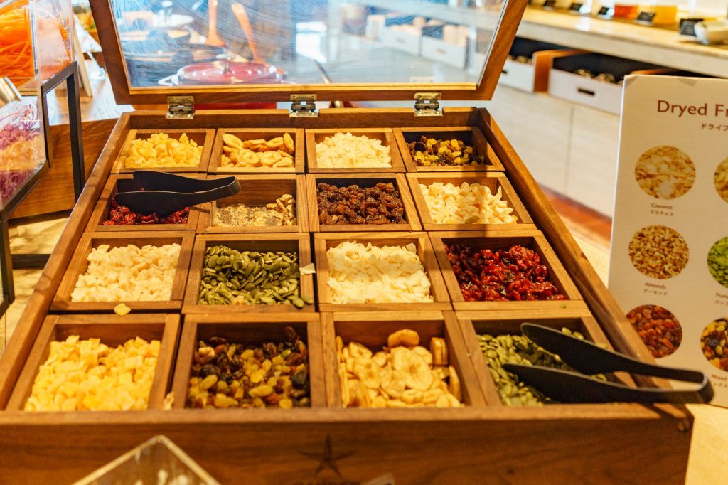 ご飯や味噌汁、パン、フルーツなどの定番はもちろん出来立ての手作り豆腐やジャンル問わず種類豊富なお惣菜、カレーなど、などこだわりの料理がいっぱい!ナッツ&シード、ドライフルーツなども充実していましたよ〜!