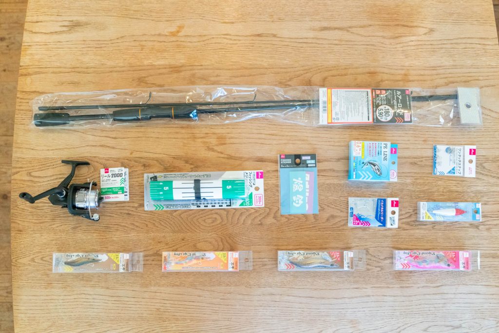 爆釣シール、PEライン、ワンタッチスナップ、イカメタルリーダー、スッテ、ルアーロッド、エギ(3.5号)×2で、合計3000円と少しくらい。