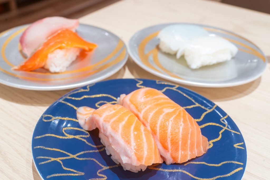 まず1回目の注文はこちら。奥にあるのが「サーモン・はまち」「こういか」、前にあるのが「オーロラサーモン」です!計3皿を注文。