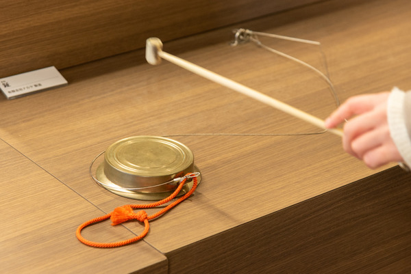 これは「枚方のわたづくり」の工程のひとつに使う、実くり(さねくり)という道具ですね。中河内・南河内は有名なわたの産地でしたが、枚方市内でも多くの家庭で、わたを糸にして、ハタで織って家族が着る着物を作っていたそうです。
