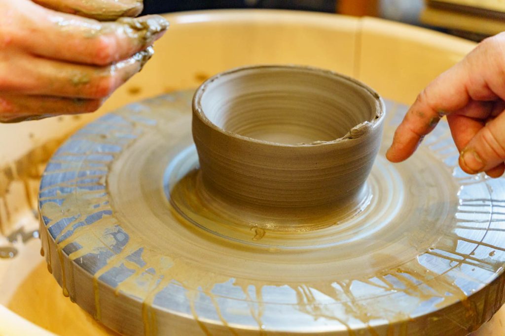 まずは電動ろくろから。土の塊をドンと置いてからゆっくりと成形していきます。