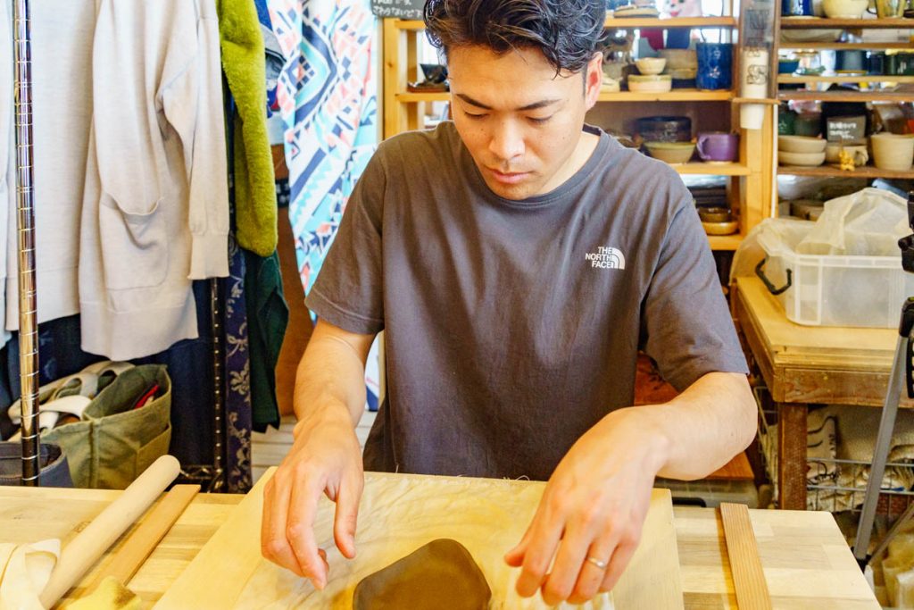 ここからは手びねり体験!見ての通り、粘土をコネコネする要領で作っていきます。何を作っても基本的にはOKなんですが、深さがあるものはツラそうな感じでした。平皿とか小鉢とかが良さげ。