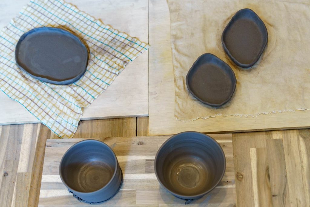 手で押したり、棒で平べったく伸ばしたりと楽しげ!ろくろと違って水分が少なめでしっかりしているのでこっちのほうが作りやすそうではあります。お子さんでもうまく作れそう。