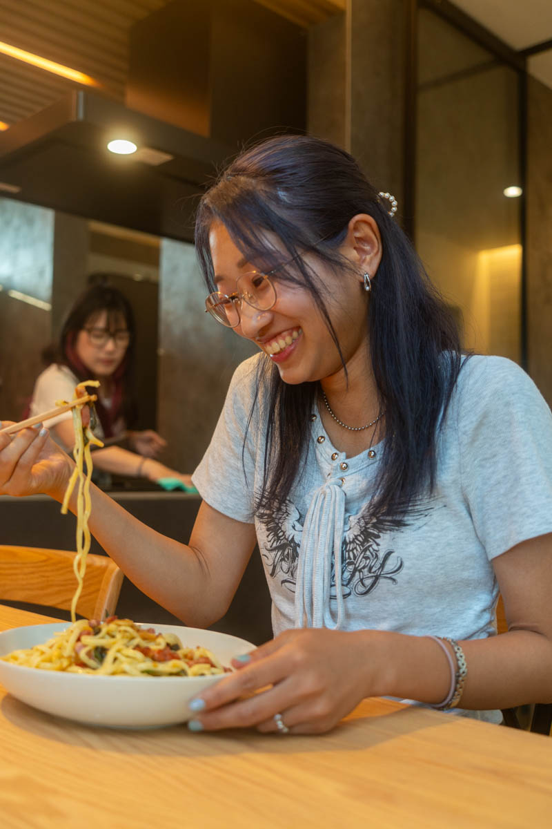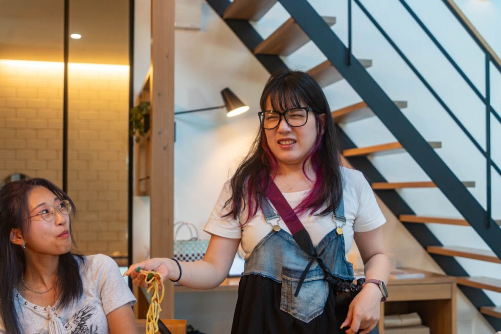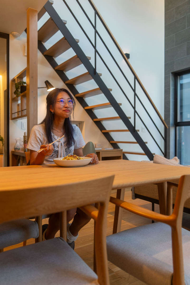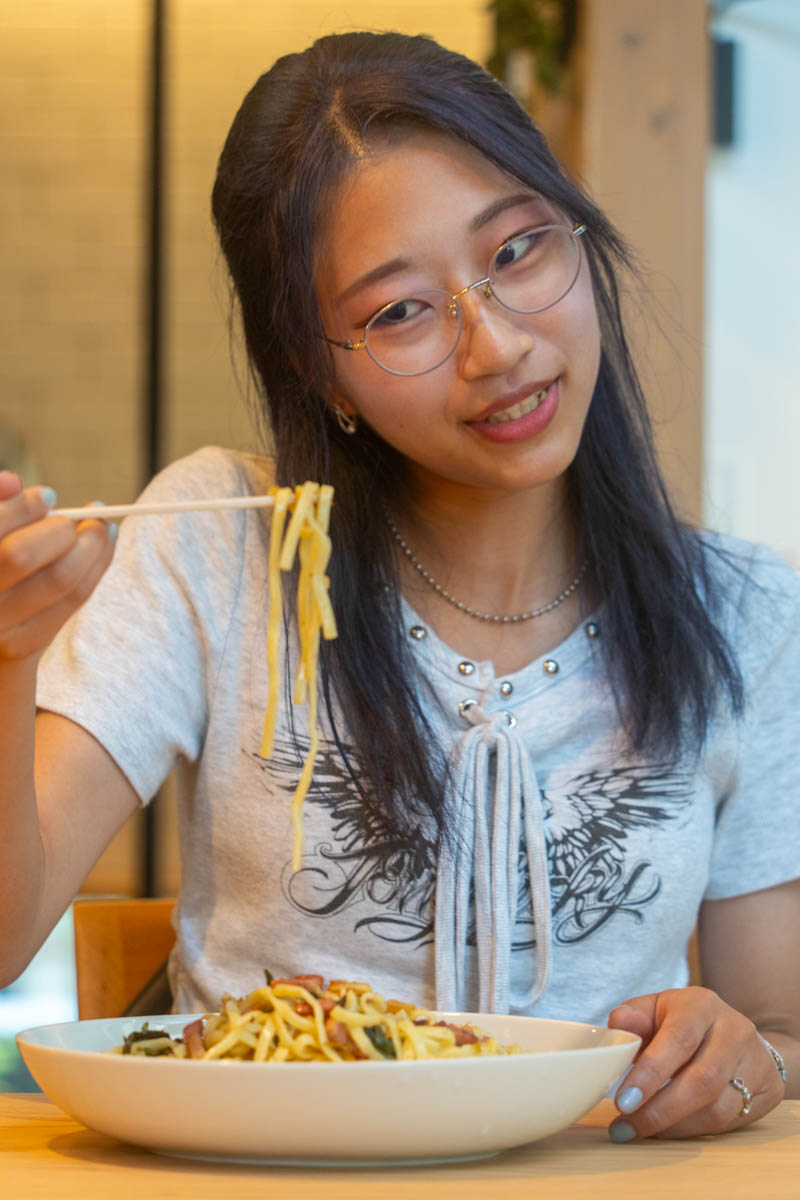 何やらスタイリッシュな空間で食事をしているのは、ひらつーアンバサダーのひまわり。