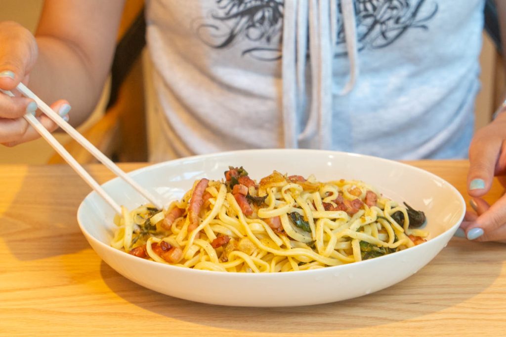 ここまで書いてなかったんですが、ドクダミをいれたんですよ。それがもう……ニンニクを上回る香草っぷりを見せてくれました。そのインパクトが口に入れると初撃でやってくるので、それを乗り越えたあとは、ただただベーコンが美味しかったです(笑)