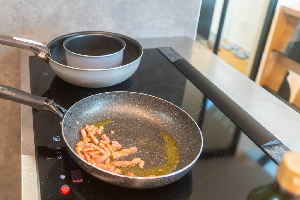 では作っていきましょう、ということで早速、ベーコンを炒めはじめました。