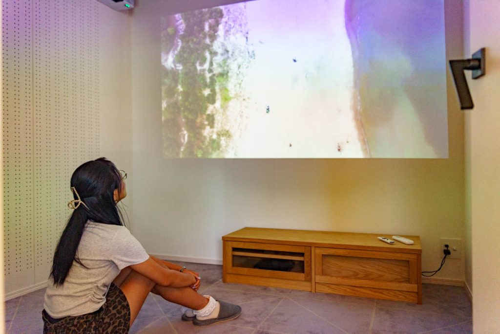 ベーコンをきっちり炒めて……ってなんだこの部屋、すご。プロジェクター付きの防音室だそうで、以前別の記事で詳しく紹介しています。
