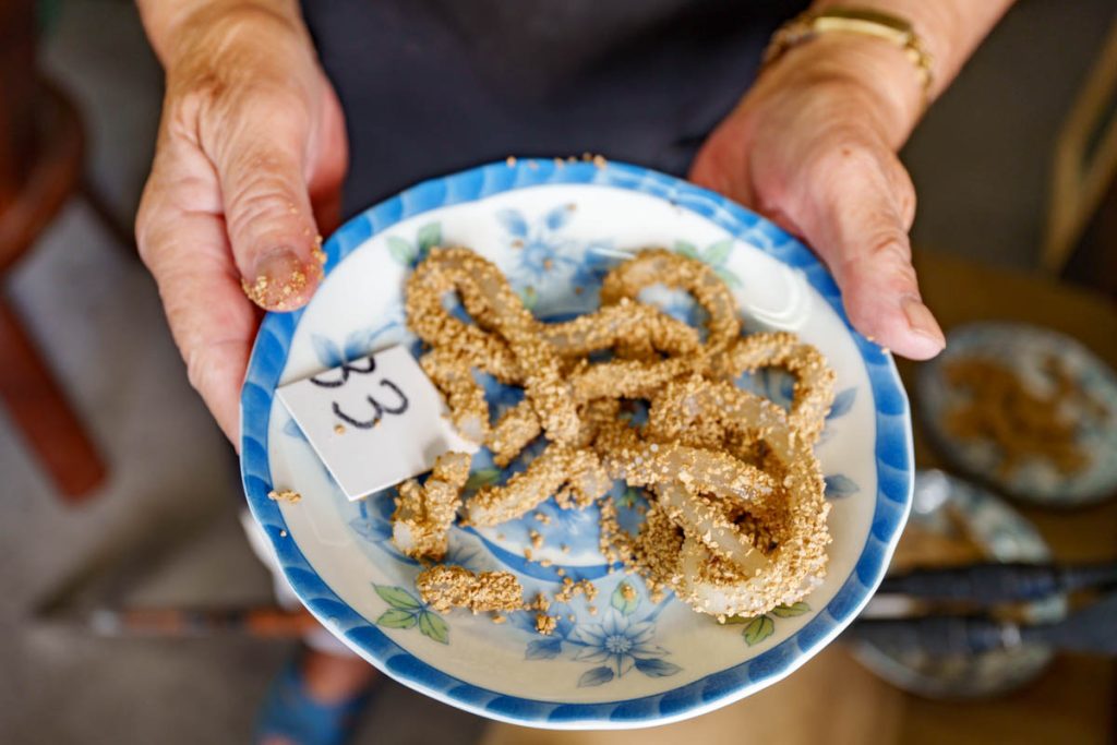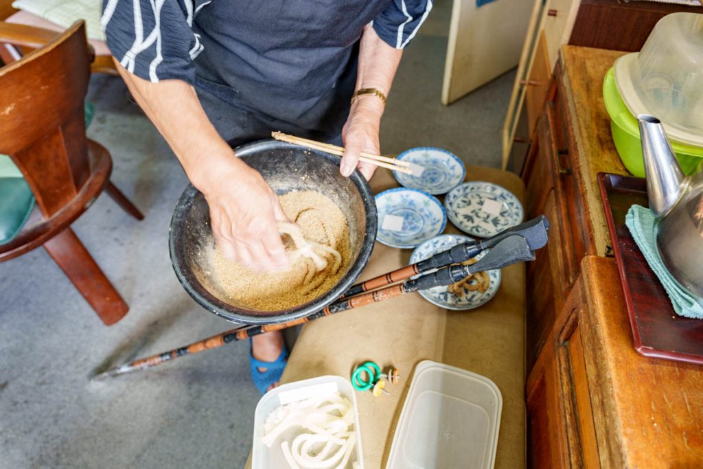 うどんに、粉をまんべんなくまぶしてエサの出来上がり。「なんの粉なんですか〜?」とお店の人にきいてみたんですが、『魚が好きな粉や』とのことでした。わかりやすい。