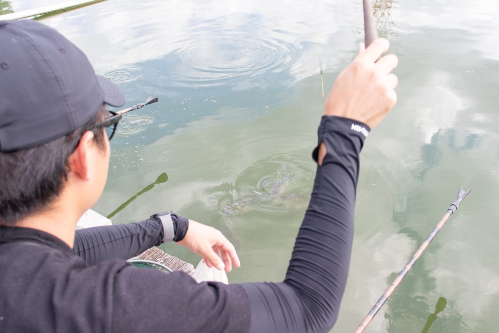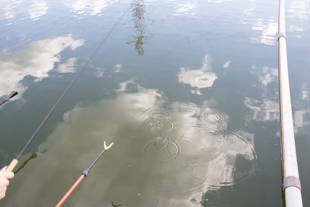 その一方で、ヘラブナは吸い込むようにエサを食べたり、ちょっと触ったりするだけで吐き出したりするそうでウキに出るアタリは「ピクッ」とか「スーッ」といった小っちゃい動きなので、そこの見極めが初心者にとっては難しいポイントなんだそう。