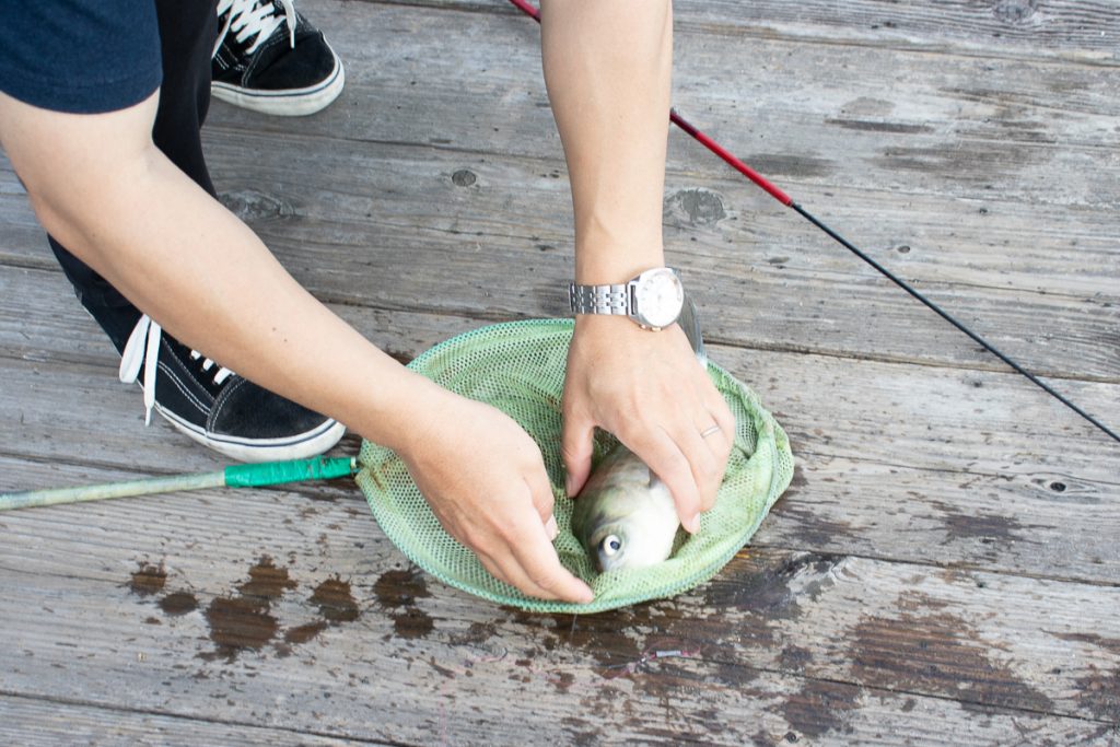 慣れない手つきで魚から針を外しつつ、恐る恐る持ち上げます。見ての通り魚はけっこうデカくて、かつめっちゃ跳ねるので初心者には扱いが難しい(笑)