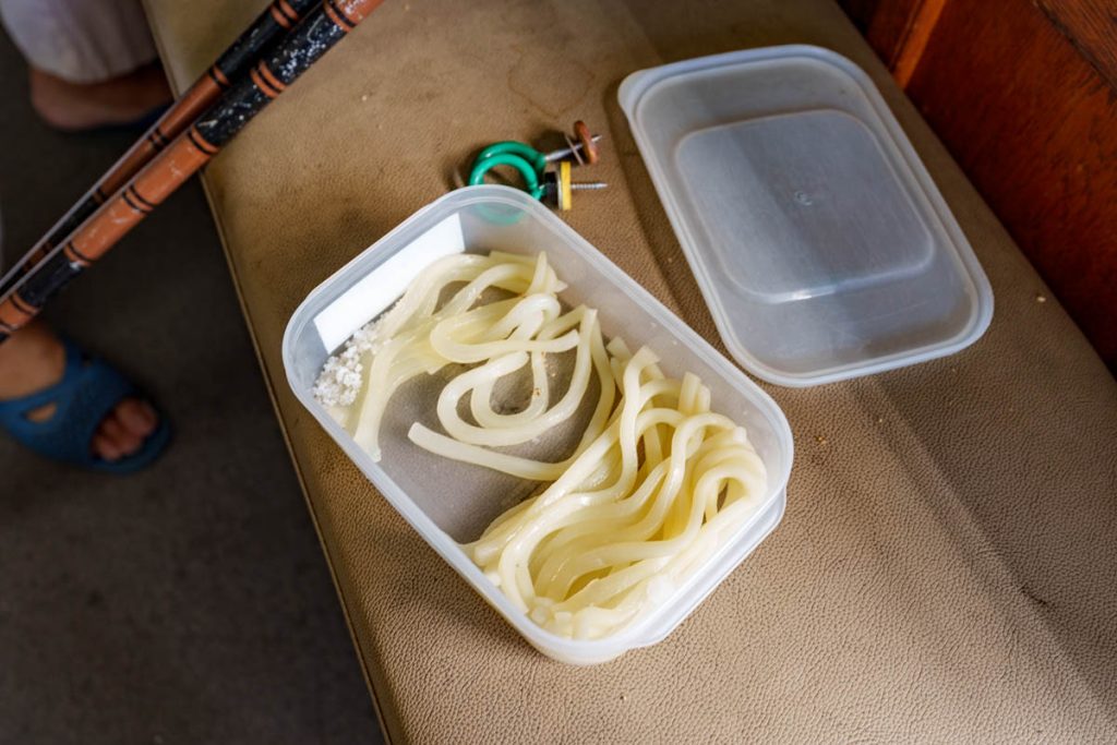 そしてこちらがエサ。見ての通りうどんです。釣りマスターとしては普通の光景なのかもですが、初心者的にはなんかシュールでおもしろい!