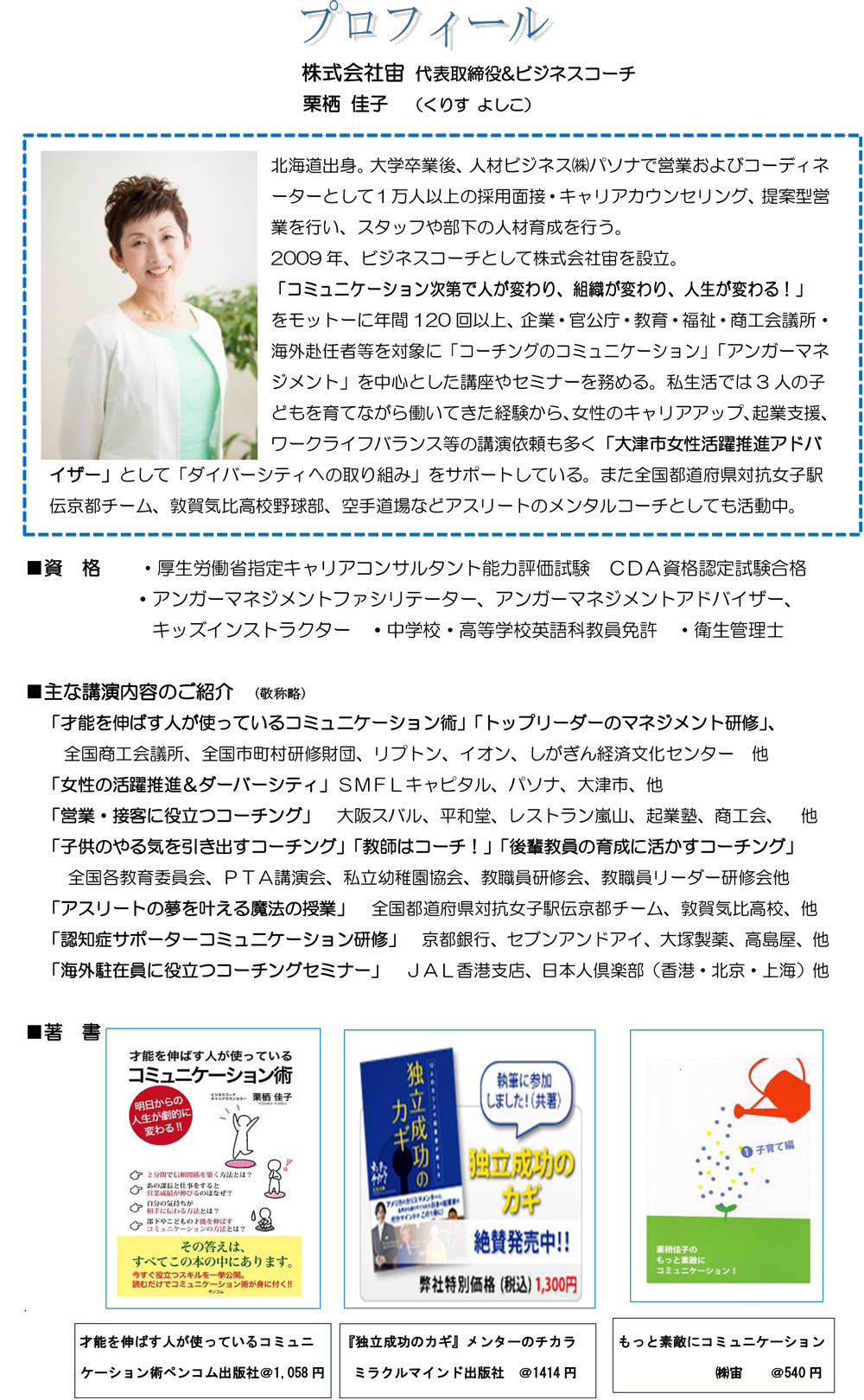 「コミュニケーション次第で人が変わり、組織が変わり、人生が変わる!」 をモットーに年間 120 回以上、企業・官公庁・教育・福祉・商工会議所・ 海外赴任者等を対象に「コーチングのコミュニケーション」「アンガーマネ ジメント」を中心とした講座やセミナーを務める。
