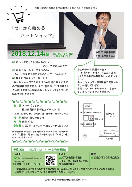 枚方市駅近くのアワーズキッチンで「ひらかたビジネスカフェ」12/14(金)開催!テーマはゼロから始めるネットショップ【ひらつー広告】