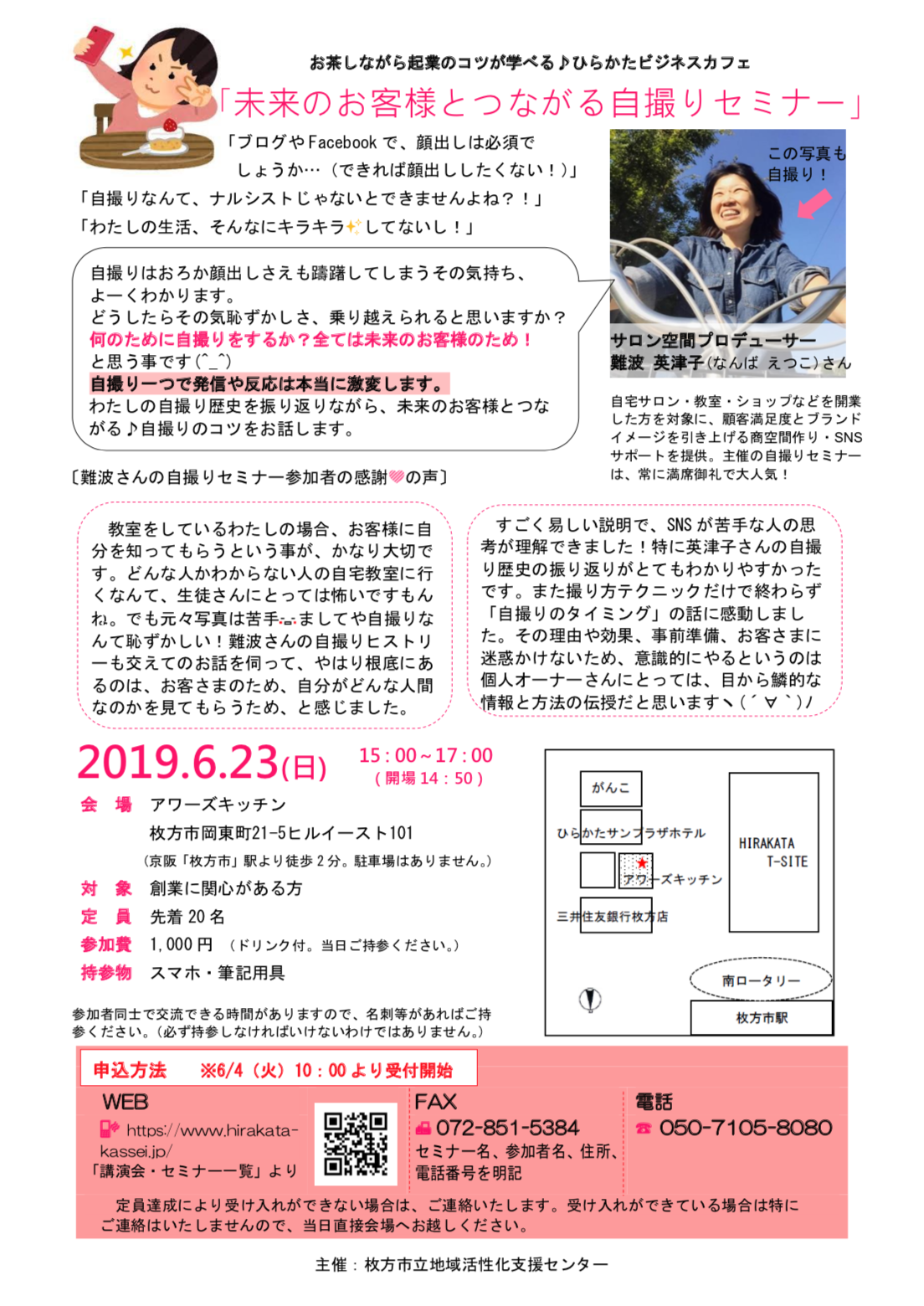 枚方市駅から徒歩2分の「アワーズキッチン」で開催(先着20名)!