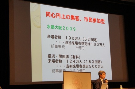 フランス・ナント市や天神橋筋商店街にある「繁昌亭」、水都大阪2009、富良野市などを例にあげて、都市のブランドを確立しているところはどのような取り組みをしているのか、どのような経緯で地域ブランドを確立させたのかを紹介。逆に失敗したところも例に出し、成功した地域と何が違ったのかを比較されていました。