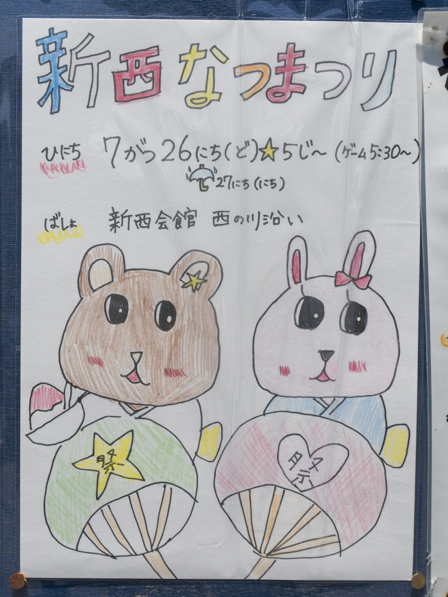 新西なつまつり | 新西会館西の川沿い →張り紙 |