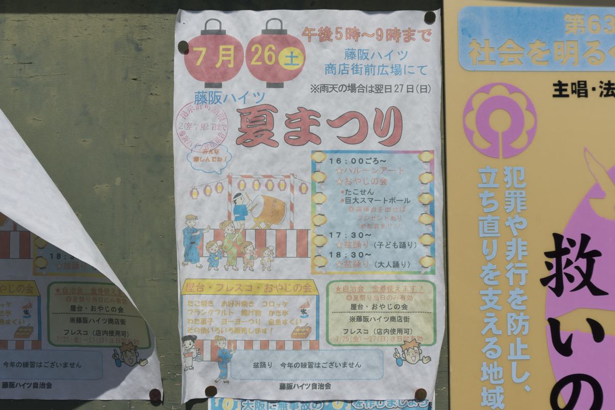 藤阪ハイツ夏まつり | 藤阪ハイツ商店街前広場 →張り紙 →地図 |