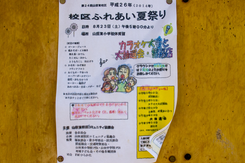 校区ふれあい夏祭り | 山田東小学校体育館 →張り紙 →地図 |