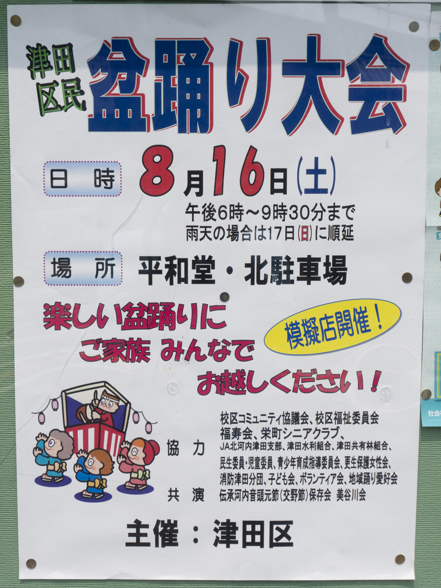 津田区民盆踊り大会 | 平和堂・北駐車場 →張り紙 →地図 |