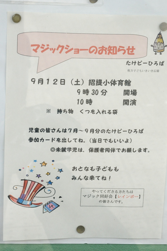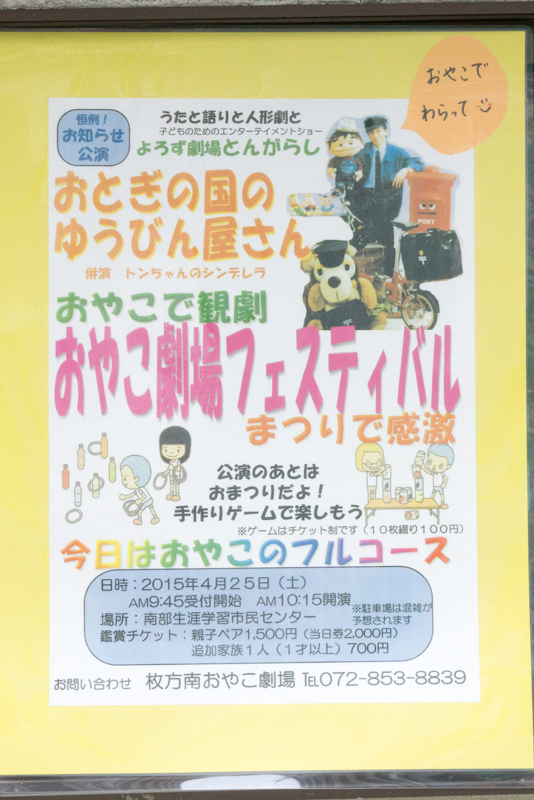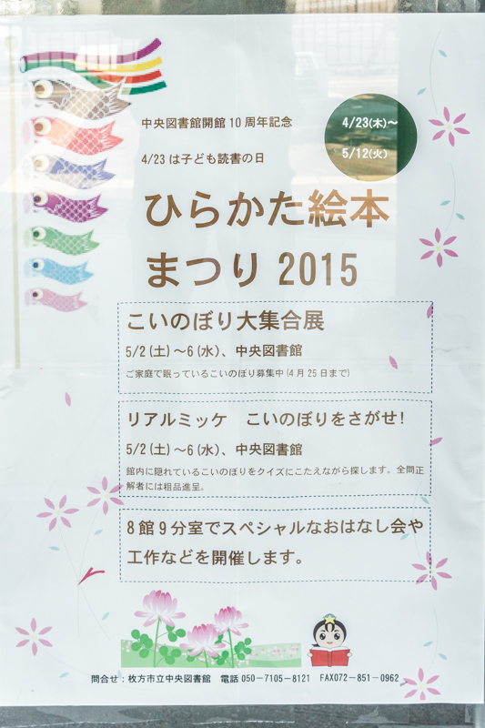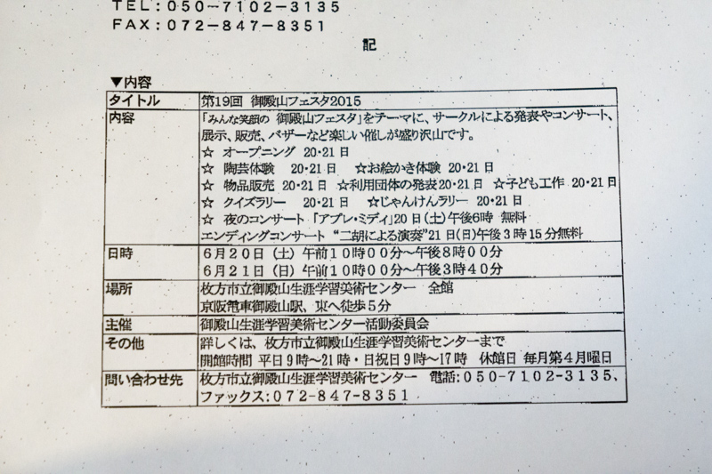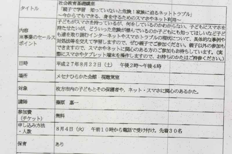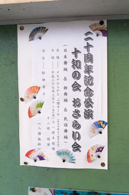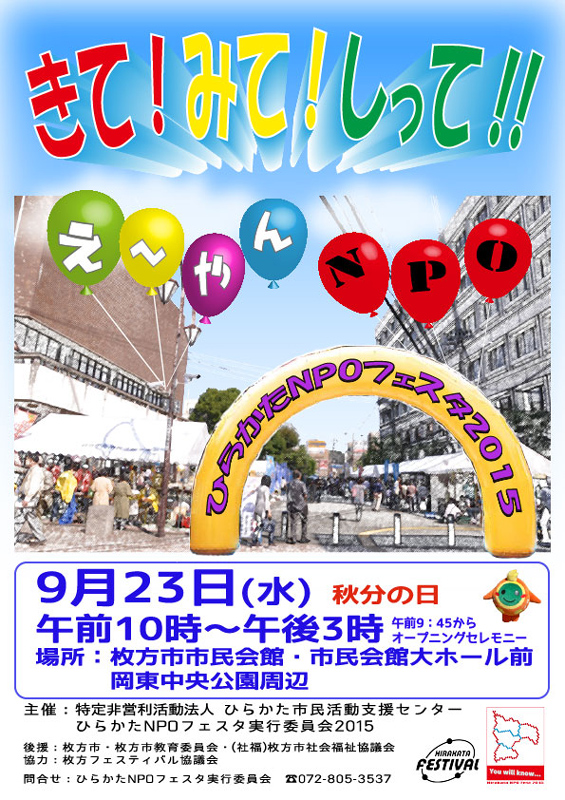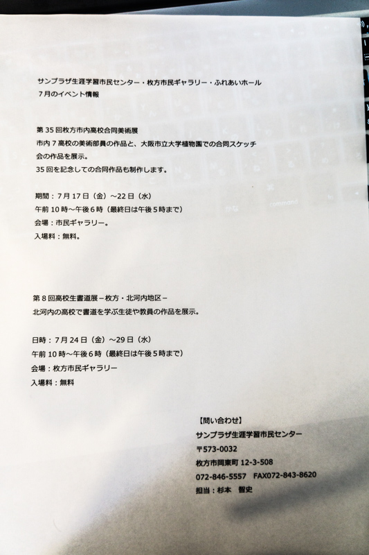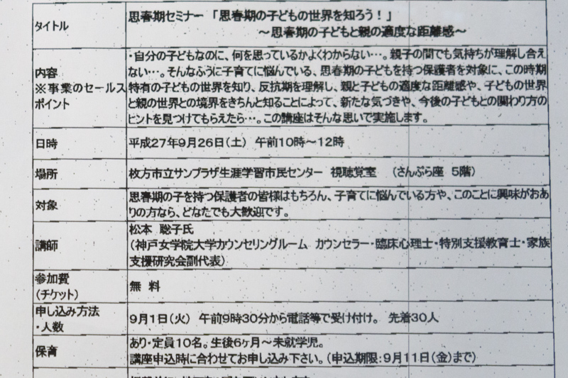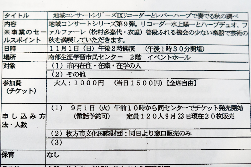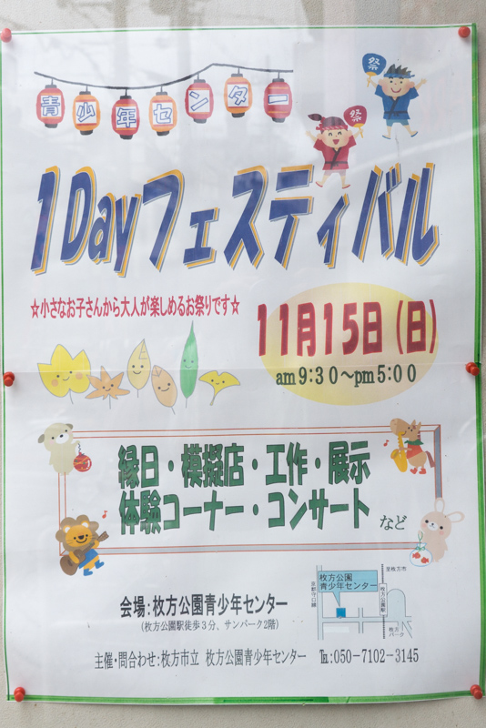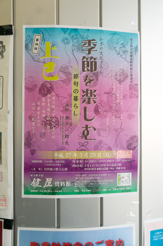 12/2:第4回A O-K Speech Contest(12/4)第22回 ひらかた吹奏楽フェスティバル(1/31)第11回 早春コンサート(2/13)おんがく玉手箱(1/30)劇団四季「コーラスライン」(2/16)アフタヌーンクラシックvol.8 癒やしの音空間(3/6)クリスマスツリーデコレーションコンテスト(12月1〜3週目の土日) 枚方アイデアソン(2/7) 枚方ハッカソン(2/14) 宇宙航空研究開発機構(JAXA) 研究員の今井 弘二さんによるお話会(12/13) 追加