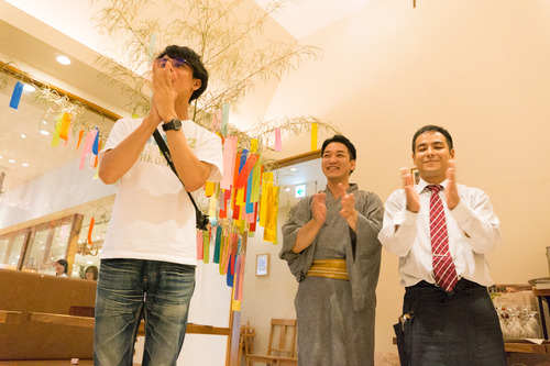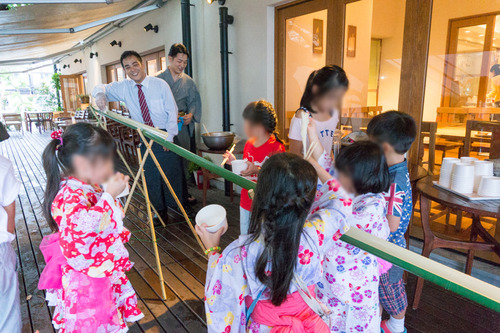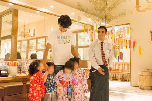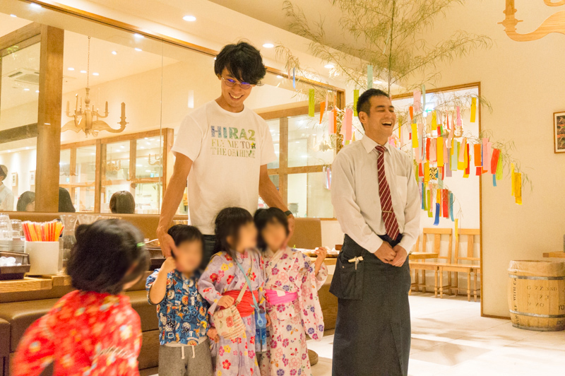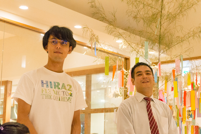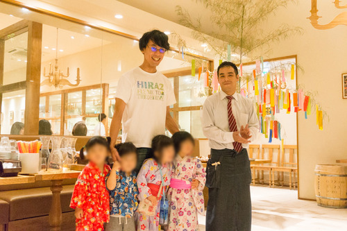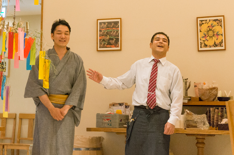 コシニールの小沼店長(右)と浴衣がステキな流しそうめん担当のイートアンドのお兄さん。