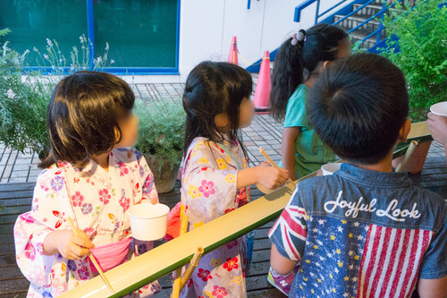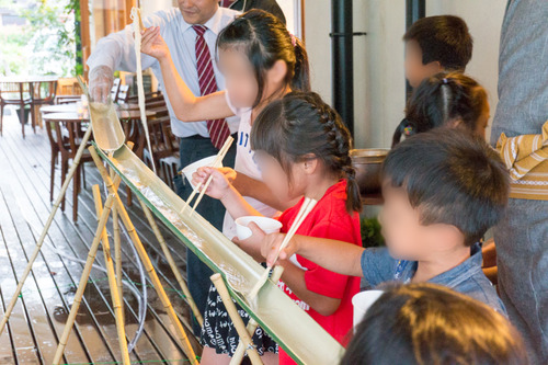 みんな器用に流れるそうめんを箸でつかまえていきます。楽しそう〜![]()