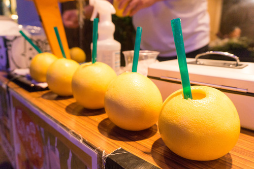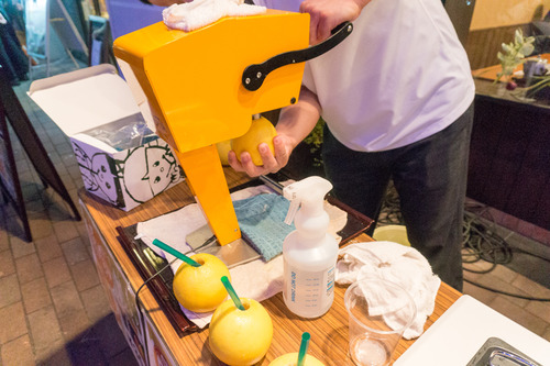 この機械を使って、グレープフルーツをそのまま器にし、フレッシュ果汁を美味しく楽しめる果汁搾りだします。