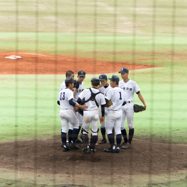 タイムをとってホームに集まった枚方津田高校の選手たち。
