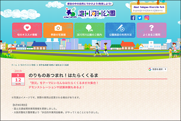 淀川河川公園で働く車が集まるイベント「のりものあつまれ!はたらくくるま」が開かれるようです。