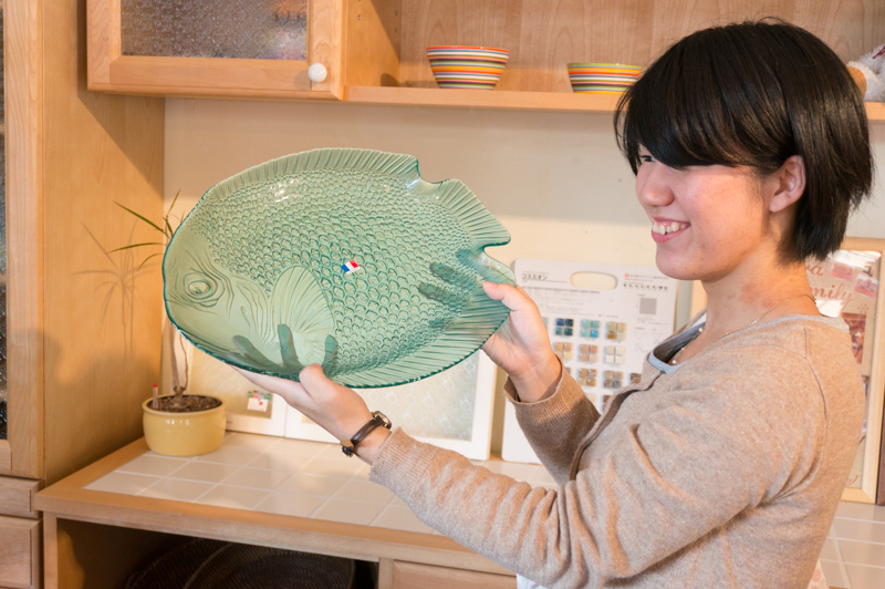 なぎーがお魚のかわいい展示用のお皿を見つけて喜んでいました。