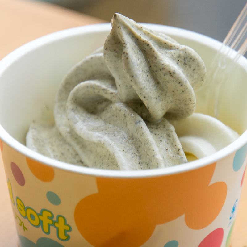 抹茶成分を混ぜてのソフトクリームのようで、白と深緑のグラデがええ感じ。