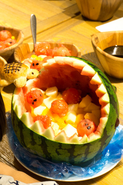 おおおー!スイカで作ったサメの中にフルーツポンチが![]()