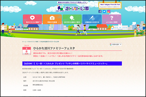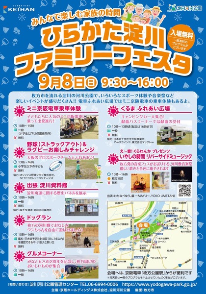 上記リンク先によると、9月8日(日)の9:30〜16:00まで、淀川河川公園 枚方地区にてひらかた淀川ファミリーフェスタが行われるとのこと。