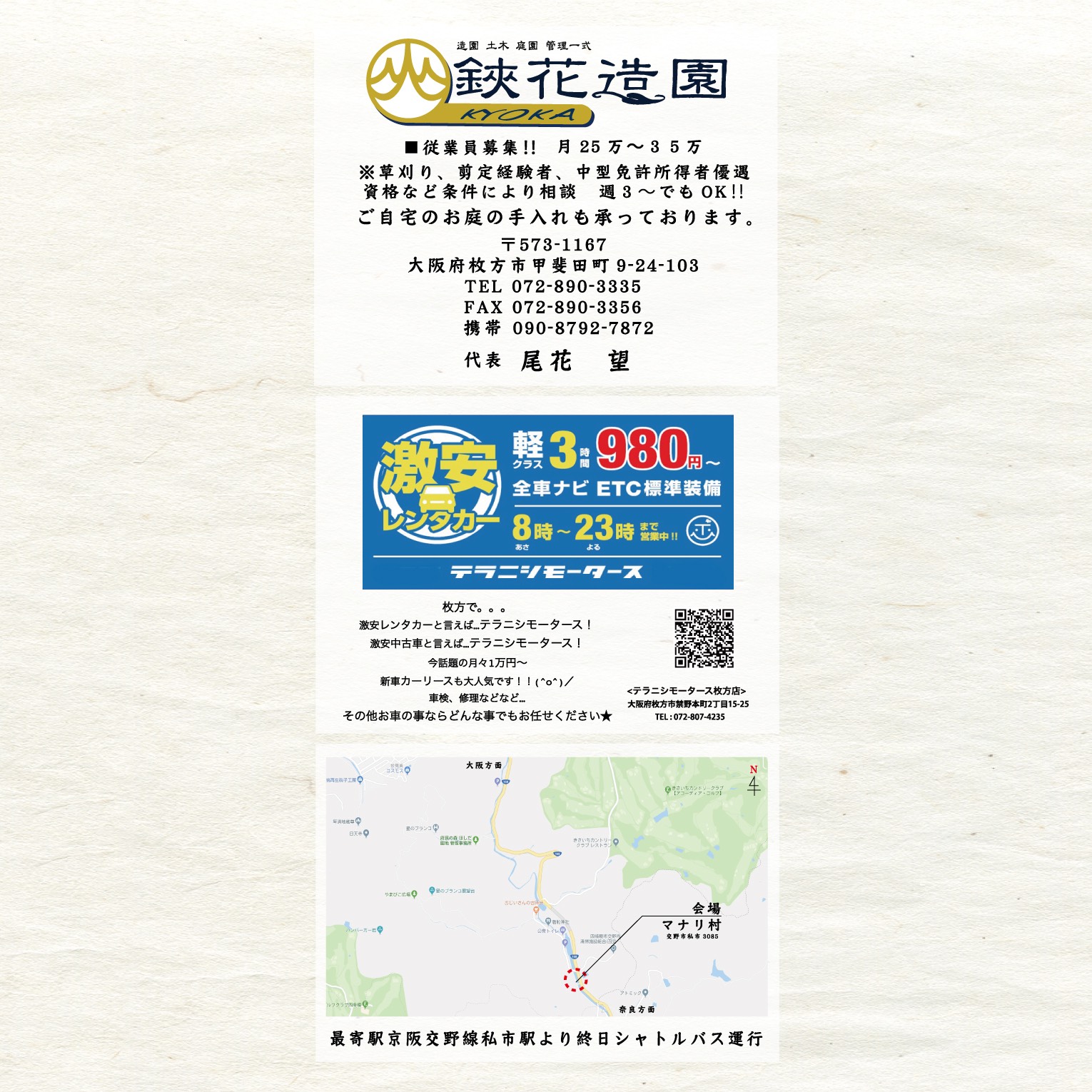 上記投稿によると、交野市私市の『マナリ村』というところで、沖縄のアーティストや大阪北部のアーティストたちによる5月19日に音楽フェスが開催される模様。京阪交野線私市駅からシャトルバスも終日運行するそうです。