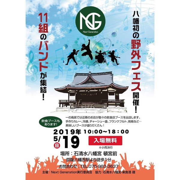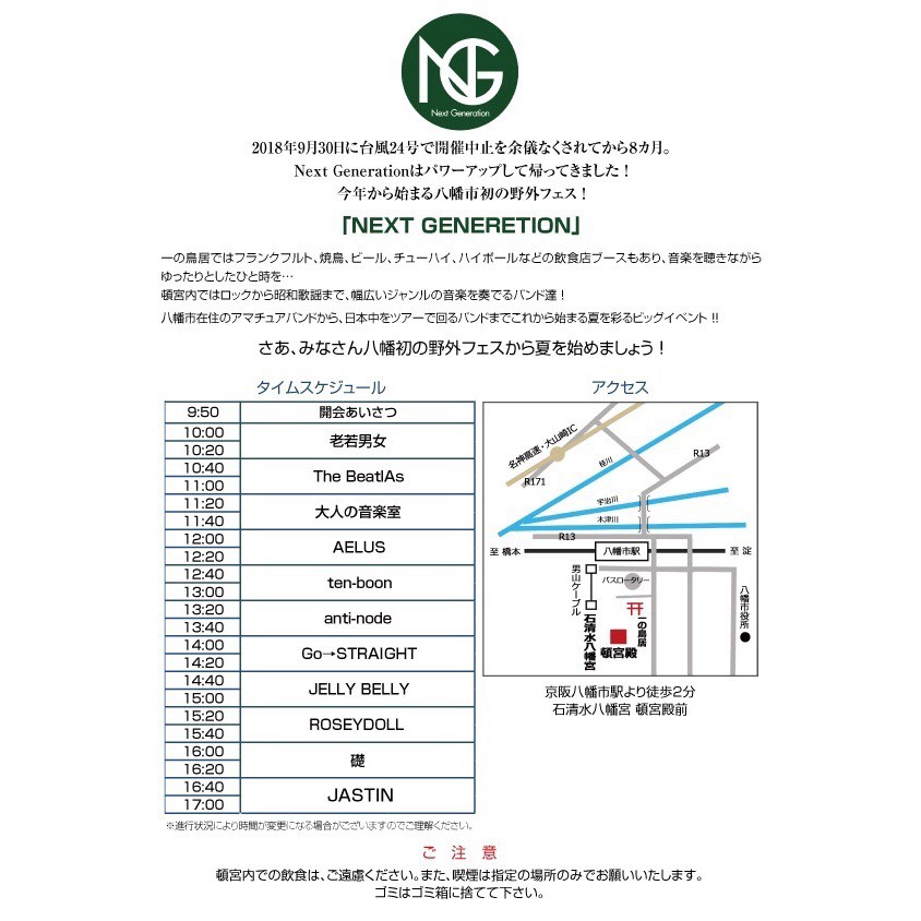 そして同日5月19日なんですが、なんとこれまたお隣の八幡市にて野外音楽フェス「NEXT GENERATION」が開催されるようです↓