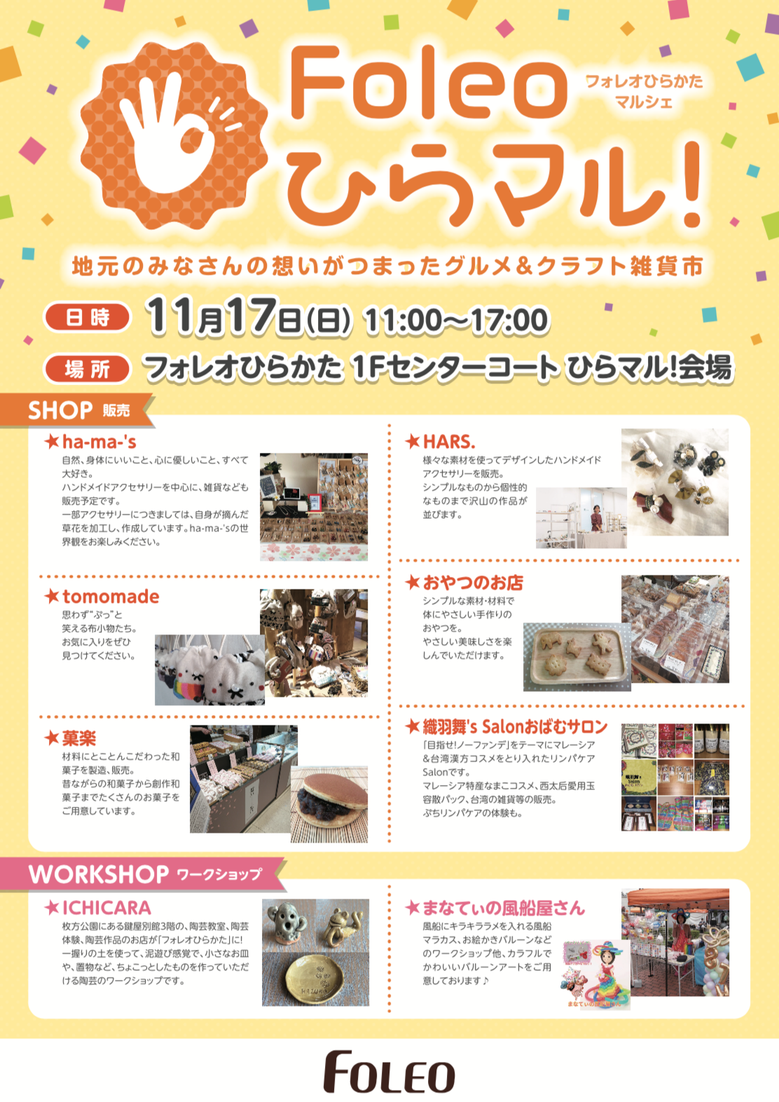 Foleo ひらマル!は枚方を中心に個人で活動しているお店を集めたグルメ&クラフト雑貨市