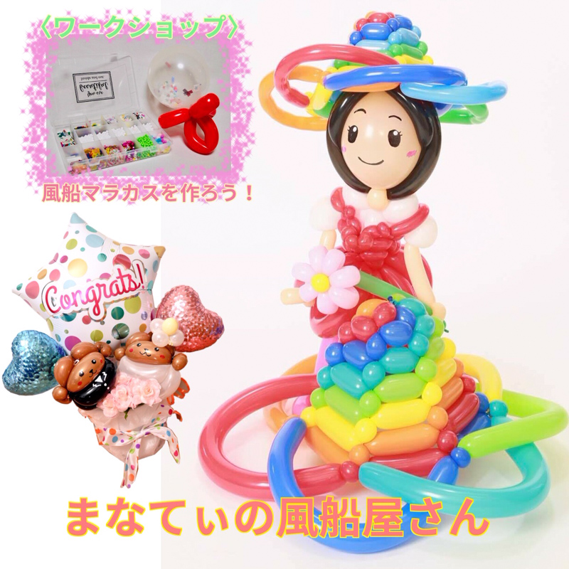 風船にキラキララメを入れる風船マラカス、お絵かきバルーンなどのワークショップ他、カラフルでかわいいバルーンアートをご用意しております♪