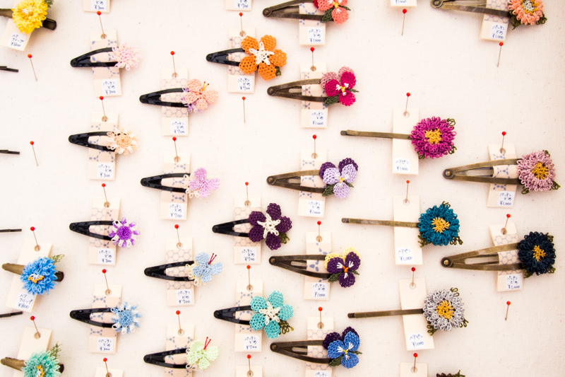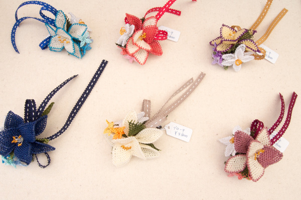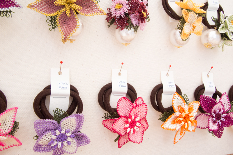 810さんの作品は、ぬい針1本で編む「イーネ・オヤ」というトルコの伝統手芸をアクセサリーにしています。