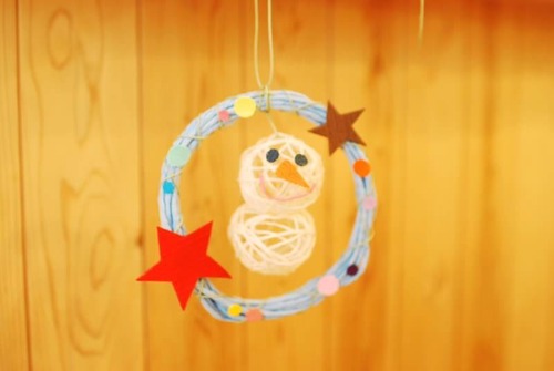 毛糸の素材がほのぼのとした可愛らしさを引き立てる雪だるまのリース。