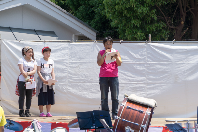 今年のヒラカタ縁Joyカーニバルは熊本復興支援チャリティーイベントでもありました。(壇上中央はチャリティーイベントの趣旨を説明する平井米穀店の平井さん)