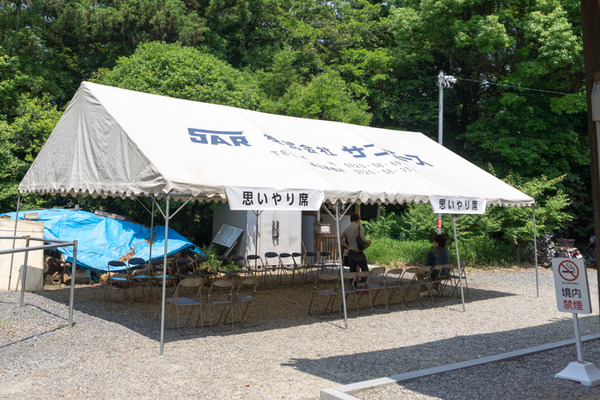 ちなみに神社本殿横には、テントの下で座って休める「思いやり席」が設けてありました。