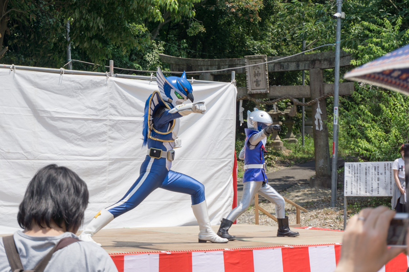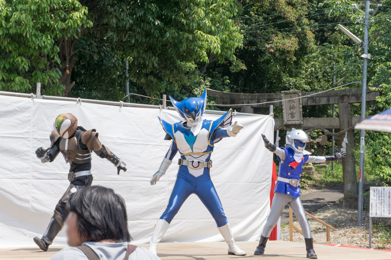 枚方市の平和を食育の力で守る 超人クラワンガー!(写真中央)その隣にはメダカイザーも!(写真右)メダカイザーは初めて見たんですが、冷静で賢い「名探偵コナン」的な感じのキャラクターで、クラワンガーショーに新しい風を吹き込んでいました。