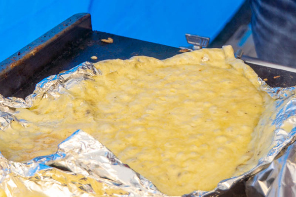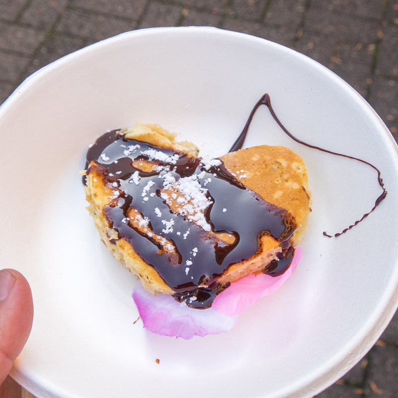 そうして購入したハワイアンパンケーキ。バナナを調理している姿が見えたので、たぶんバナナが練り込まれてるっぽい本格派。またしても違ってたらすみません。