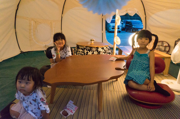 テントの中でコタツってなんとも斬新。記念撮影中の姉妹をパチリ♪